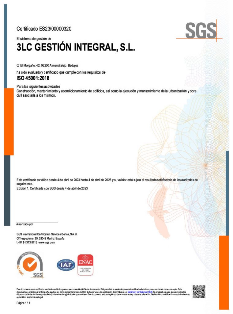 3LC Gestión Integral, en su compromiso por la calidad de sus servicios, en un proceso de mejora continua, acaba de conseguir la certificación ISO 45001 de Gestión de seguridad y salud en el trabajo y de renovar la certificación ISO 9001 de gestión de la calidad, la ISO 14001 de protección del medio ambiente.