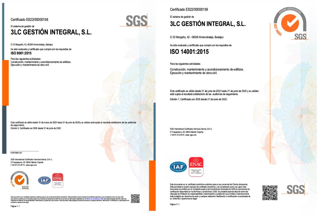 3LC Gestión Integral, en su compromiso por la calidad de sus servicios, en un proceso de mejora continua, acaba de conseguir la certificación ISO 9001 de Gestión de la calidad y la ISO 14001 de Gestión Ambiental.